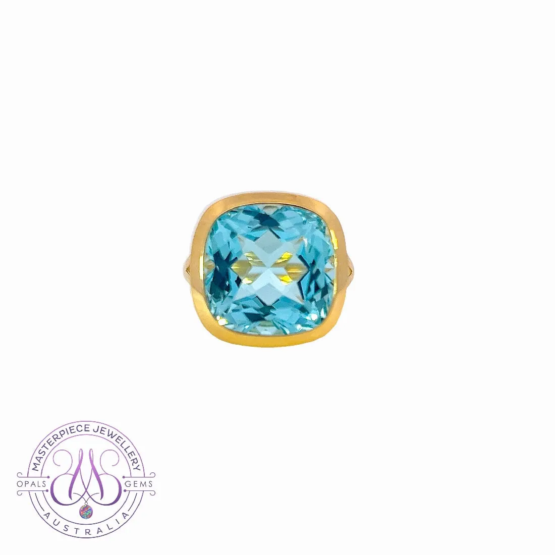 This stunning statement ring features a 15.6ct Sky Blue Topaz gem set in an intricately crafted 18kt Yellow Gold bezel. Its solitaire cushion cut is a dazzling way to show off the natural beauty of this large and luxuriant gemstone!