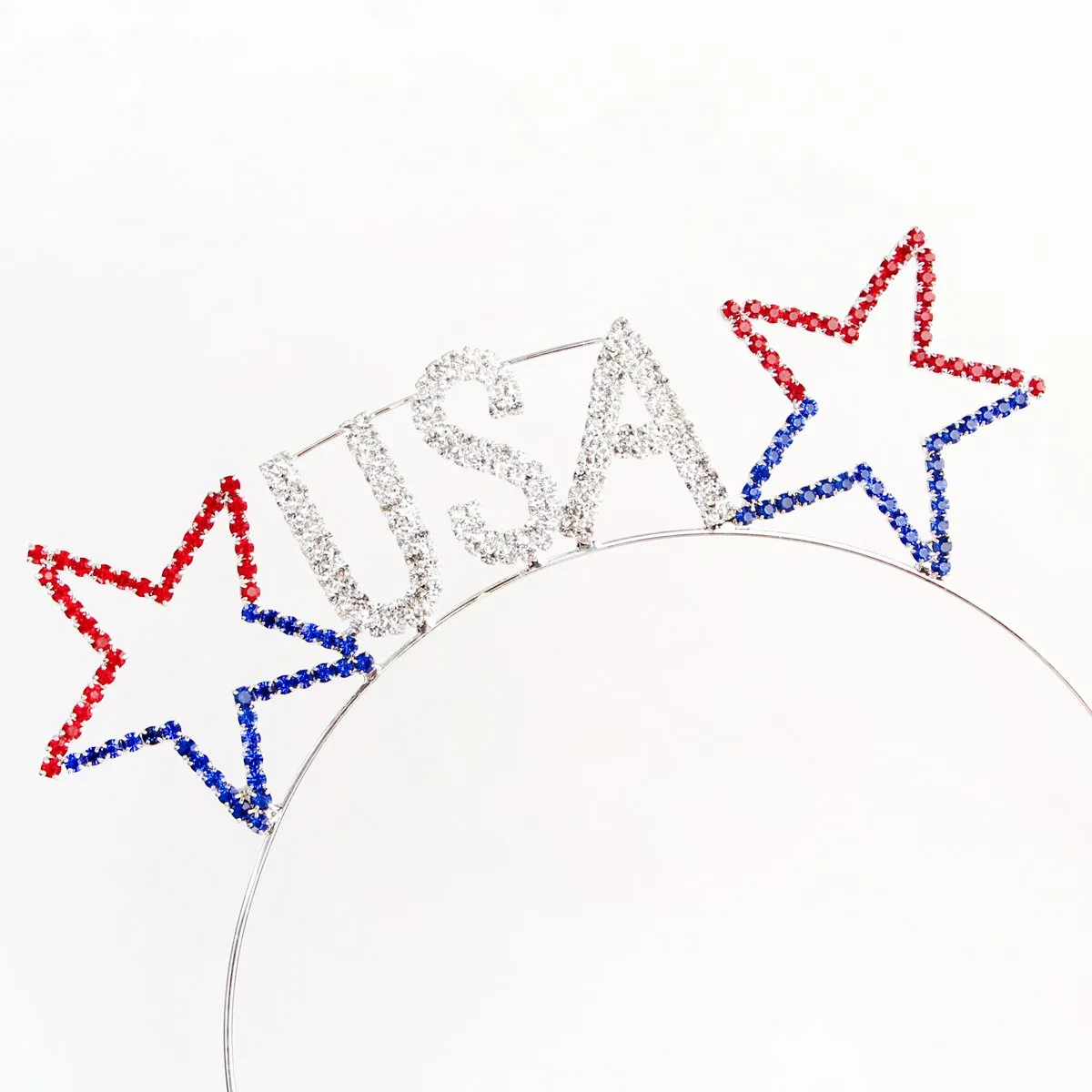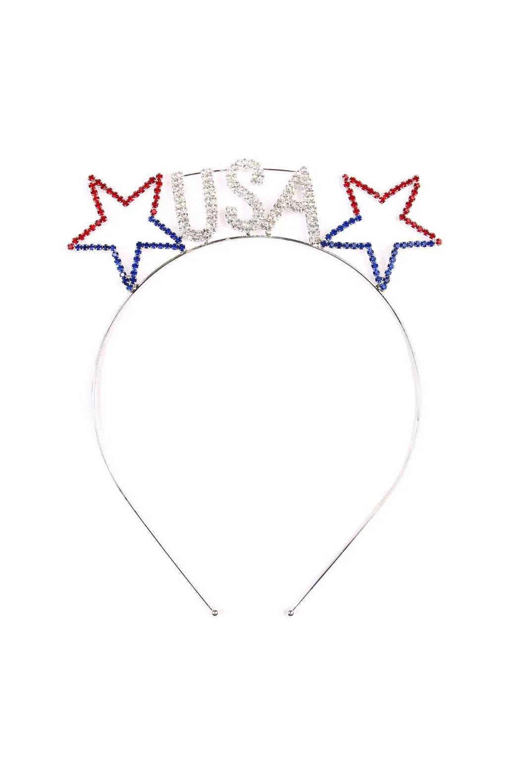 Get your hands up 'cause it's a party in the USA! A summer-ready headband, featuring a red, white, and blue USA accent with rhinestones and a metallic band.