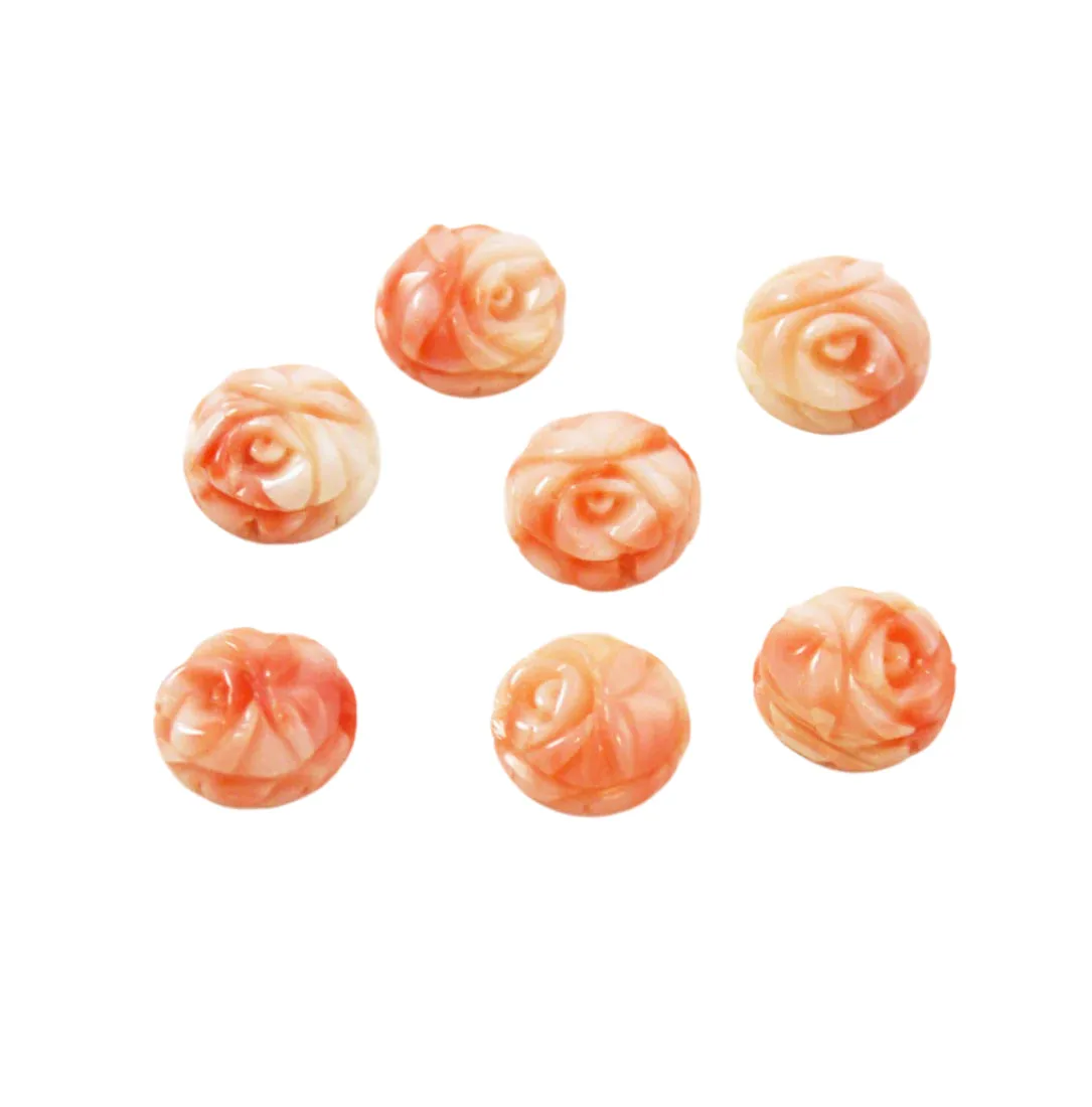 Beautifully carved pink coral flowers. They are a nice light to medium pink color and they are rounds. They were hand carved and have a flat back with a little hole in the back, ready to glue on a stem flat service. (Not drilled through) Perfect for making earrings or brooches. These are new/old stock from the 1970's.