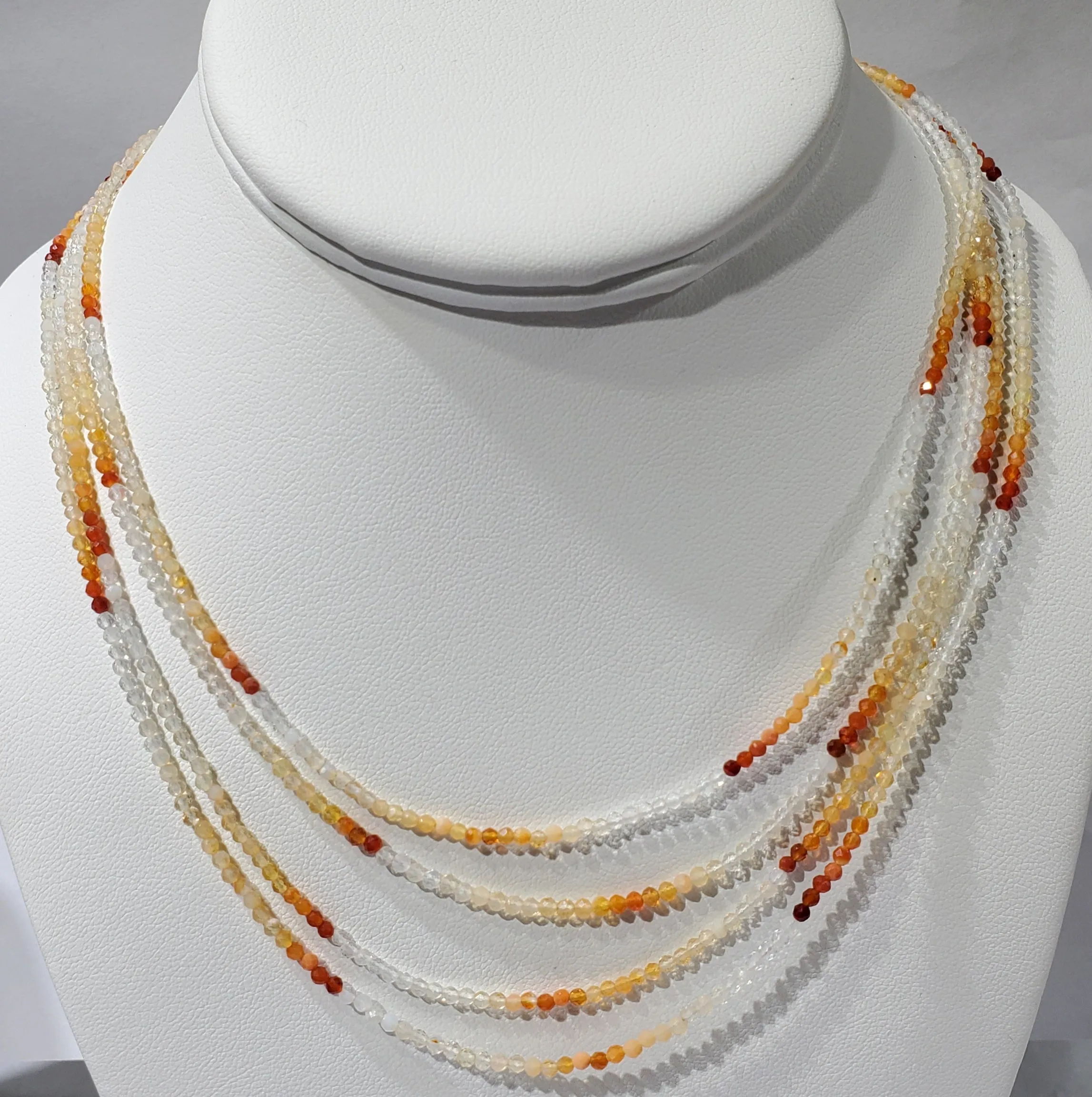 Each of these beautiful faceted fire opal beads necklaces measures 425 mm in length with adjustable chain. The beads are 2 mm.