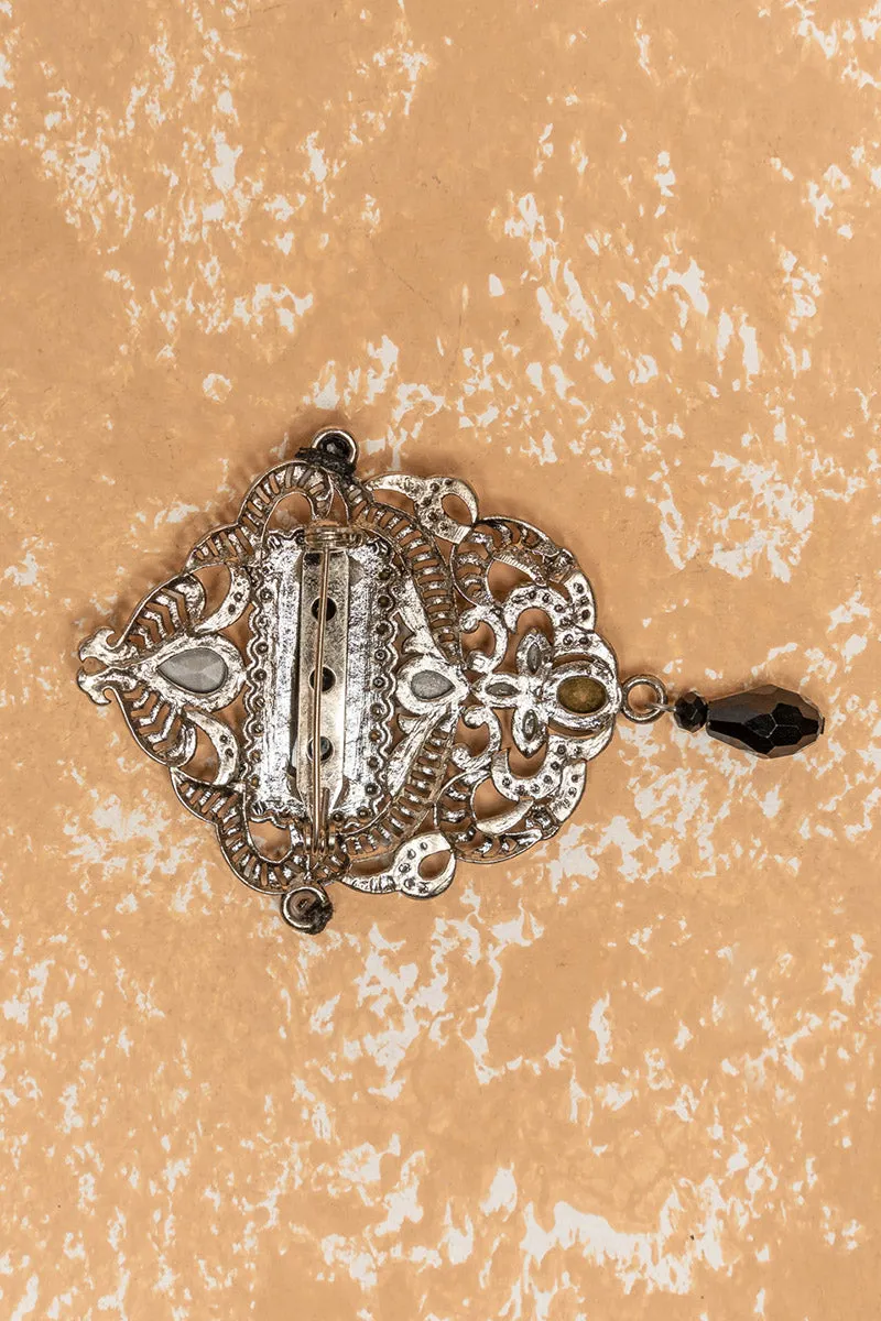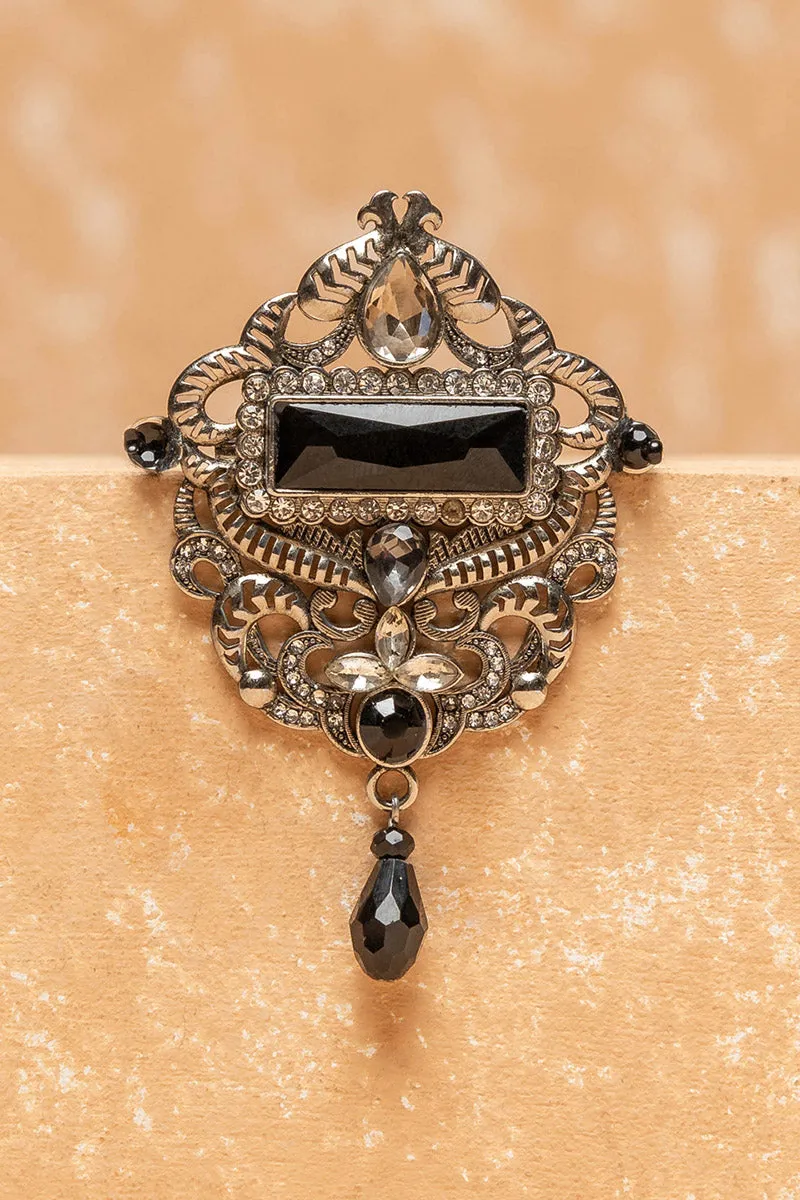 Accessories are hands-down the best ways to elevate the elegance of any attire. This thoughtfully designed brooch features beautiful silver stones and a striking black crystal that adds to its unparalleled charm. The uniquely crafted floral design makes it a standout piece that is bound to captivate everyone's attention. Put it on a black bandhgala suit or an indo-western sherwani to make an entrance that will be talked about for years.