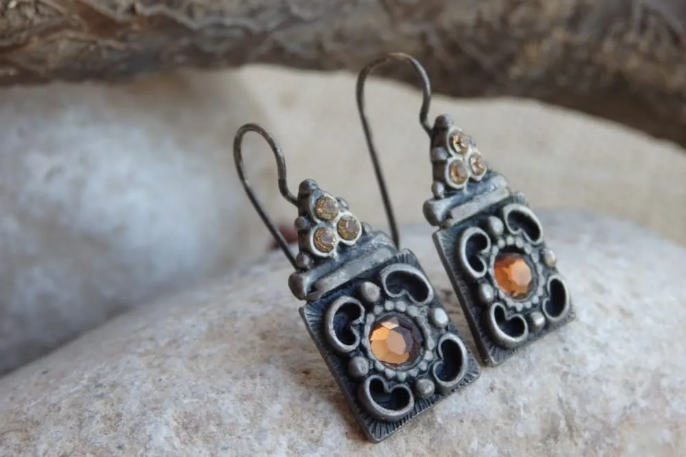 Silver sterling 925 earrings. Bridemaids Rebeka drop earrings. Brown crystal earrings. Square drop earrings. Wife gift. Vintage earrings